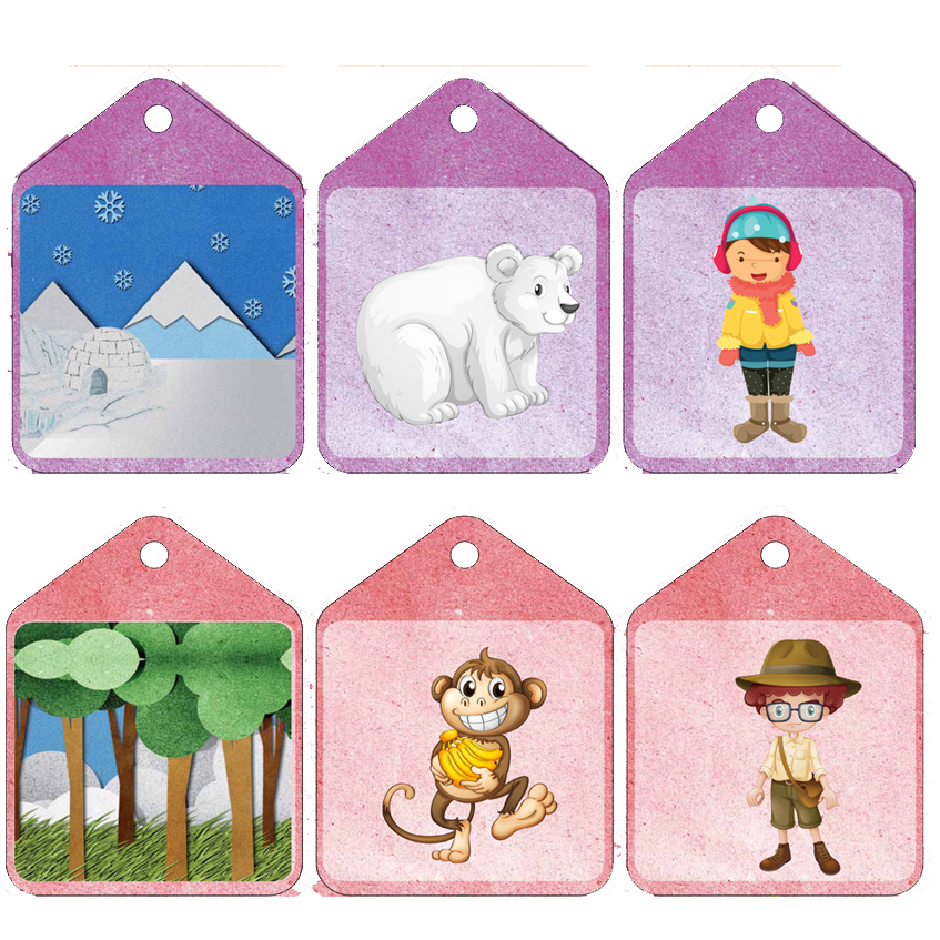 6 כרטיסיות של בעלי חיים בסביבות השונות
